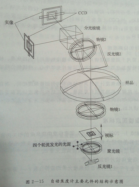 自动焦度计会自动调焦,不需要人为地判别像是否清晰(仪器内有专门的元件来判别,如CCD)。济南验光配镜培训学校的高级验光配镜师给大家解析:这两种调焦方法的利弊是很明显的,自动调焦排除了人为因素,有良好的重复性,图2-15所示为自动焦度计主要元件的结构示意图。