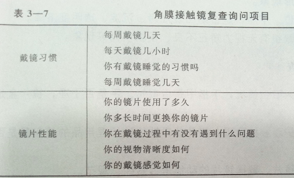 (3)询问戴镜者有无不适自觉症状:异物感、充血、流泪、灼痛、压迫感等,并要问清楚是戴镜后马上出现还是戴镜一段时间后出现,或是与戴镜无关。