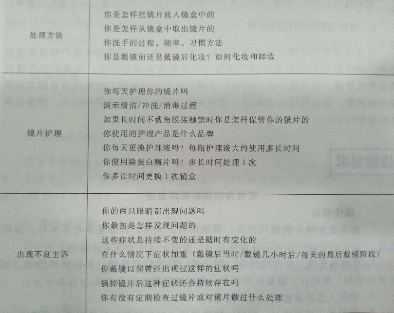 (2)与SCL戴镜者交流应多方询问戴镜者的主观感觉、配戴方式、护理镜片的流程,观察他们护理镜片的实际操作方法。